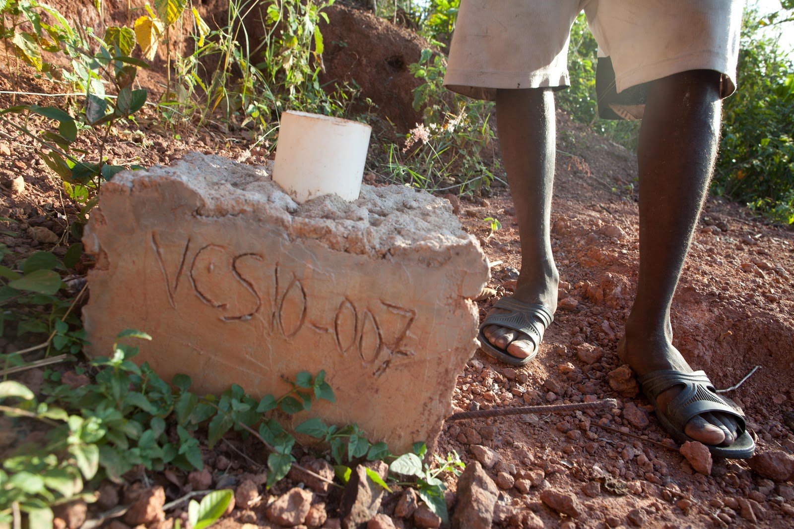 A Haitian farmer stands next to a marker indicating where VCS made a test drill